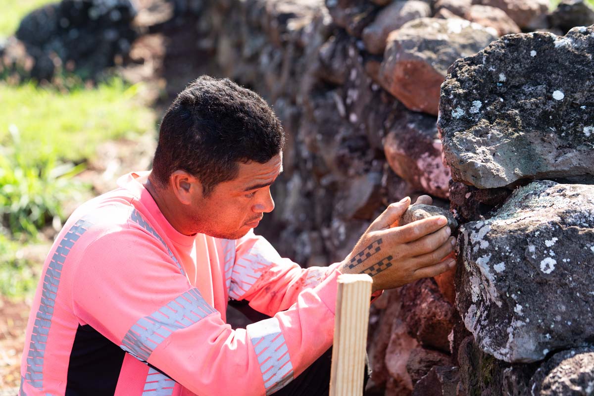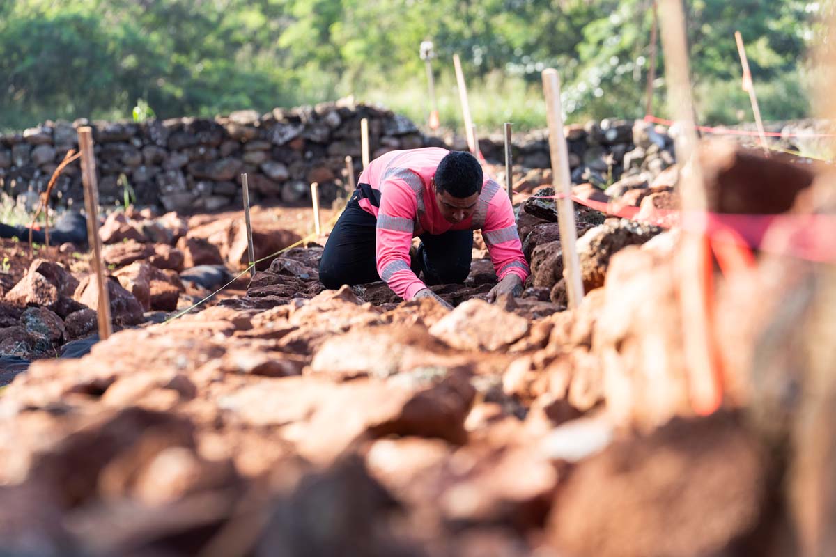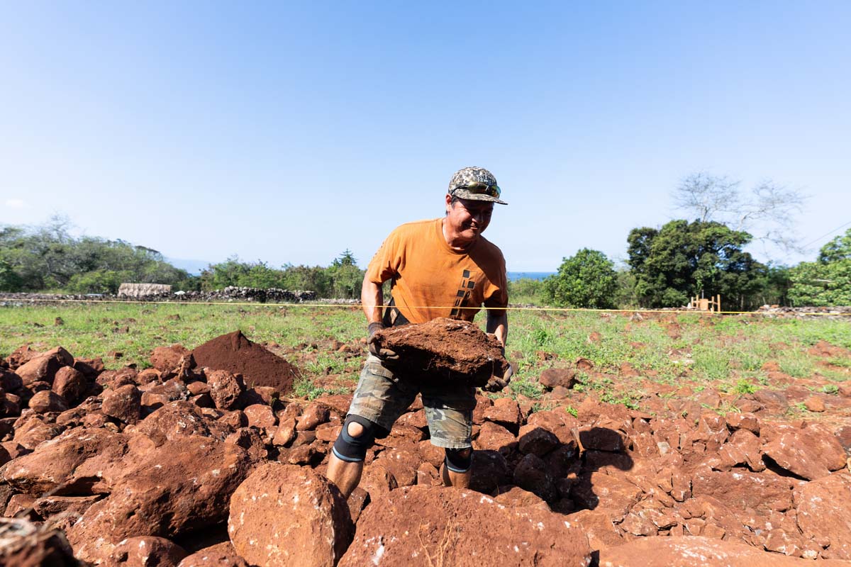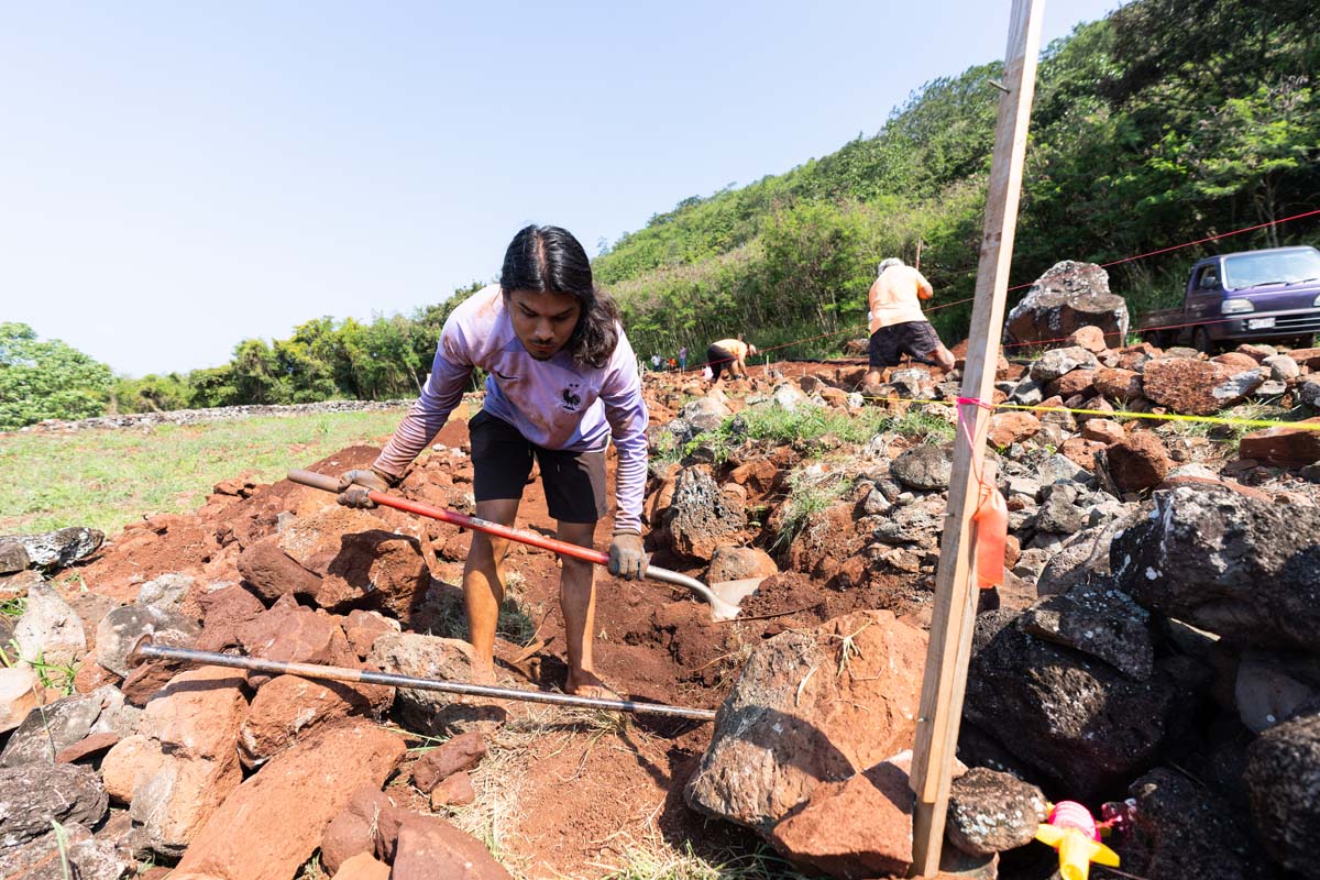 In 2024, with much of the soil removed, a group of uhauhumu pōhaku — stone masons — with on-site consultation from legendary builder Francis Palani Sinenci, began restoring the rockwall structure.
