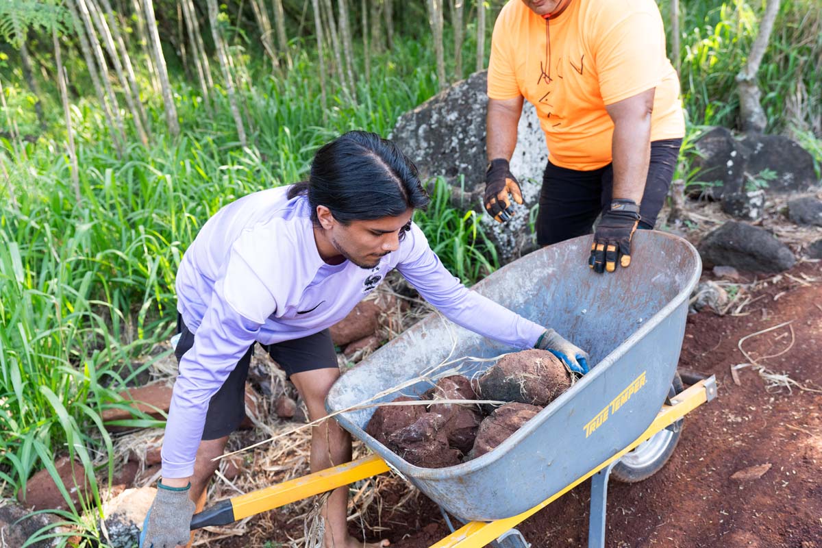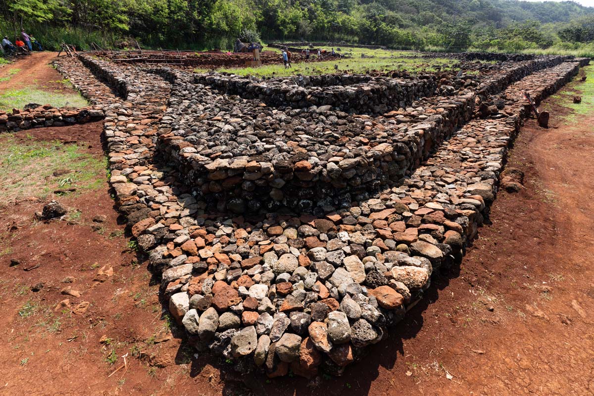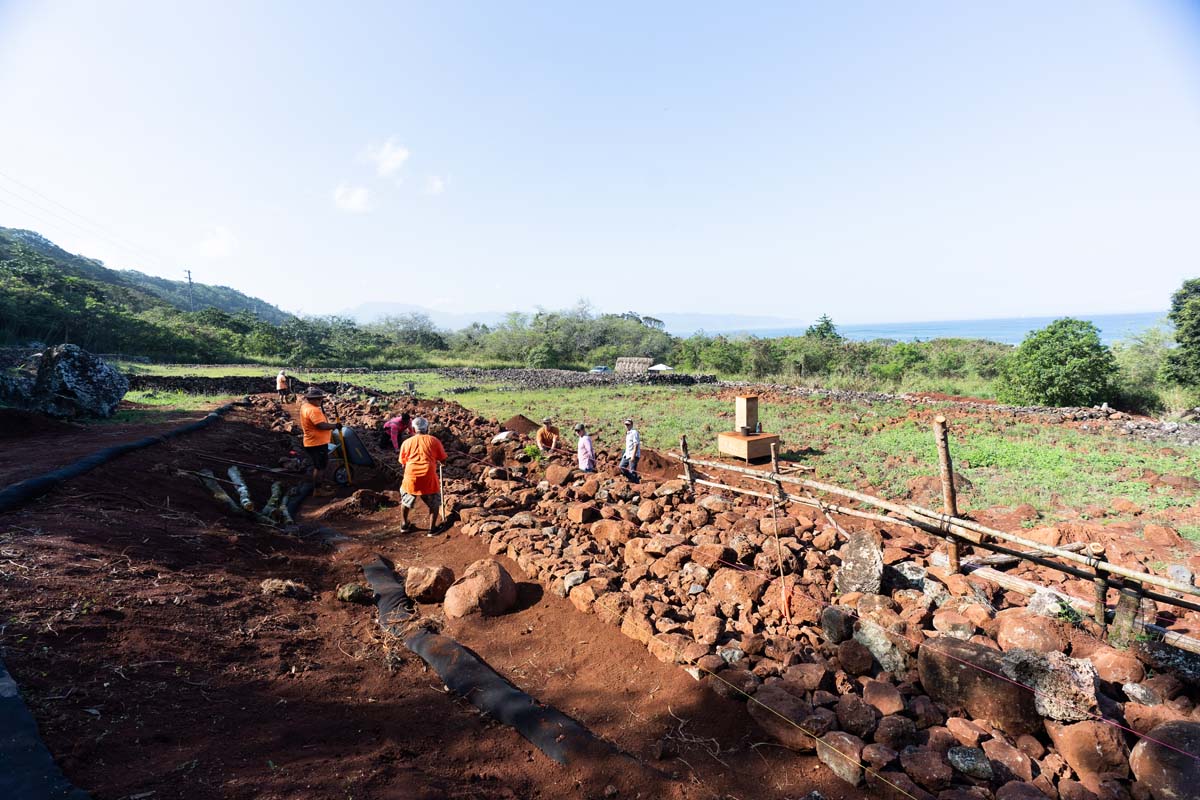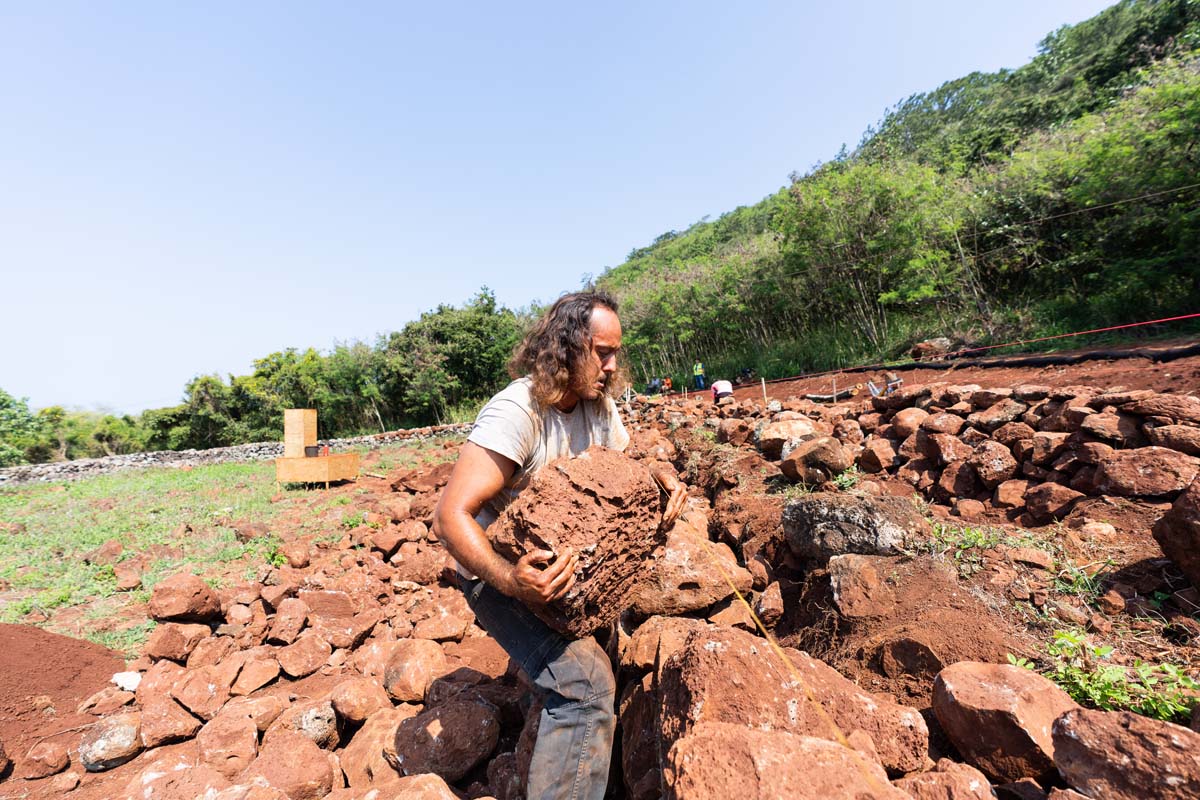 In 2024, with much of the soil removed, a group of uhauhumu pōhaku — stone masons — with on-site consultation from legendary builder Francis Palani Sinenci, began restoring the rockwall structure.