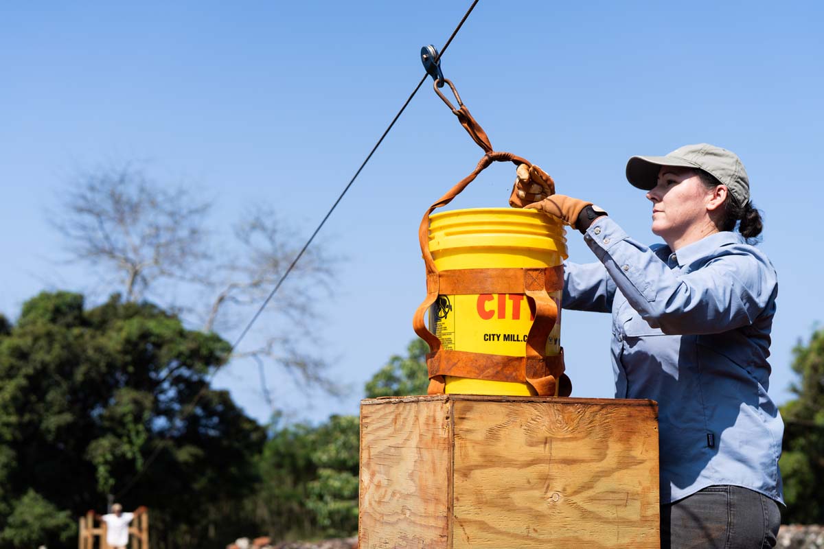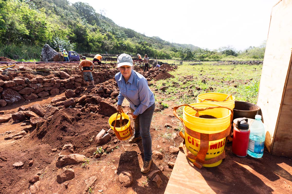 The removal of over 300 tons of lepo ‘ula‘ula was delicate and painstaking. No excavators, just hand tools and buckets. Contractor Pacific Legacy engineered an ingenious portable zipline pulley system that allowed workers to load the lepo into buckets and send it ma kai to a stockpile area without disturbing the rockwall structures. Well over 20 thousand bucketloads have been filled and emptied using this method.